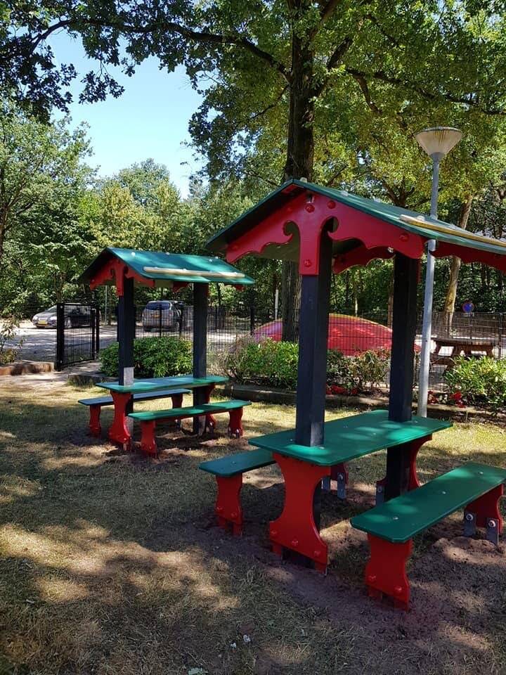 Bij de Bistro staat een leuk klim en klauter toestel met glijbaan, mini picknick tafels en een grote paddenstoel springkussen.