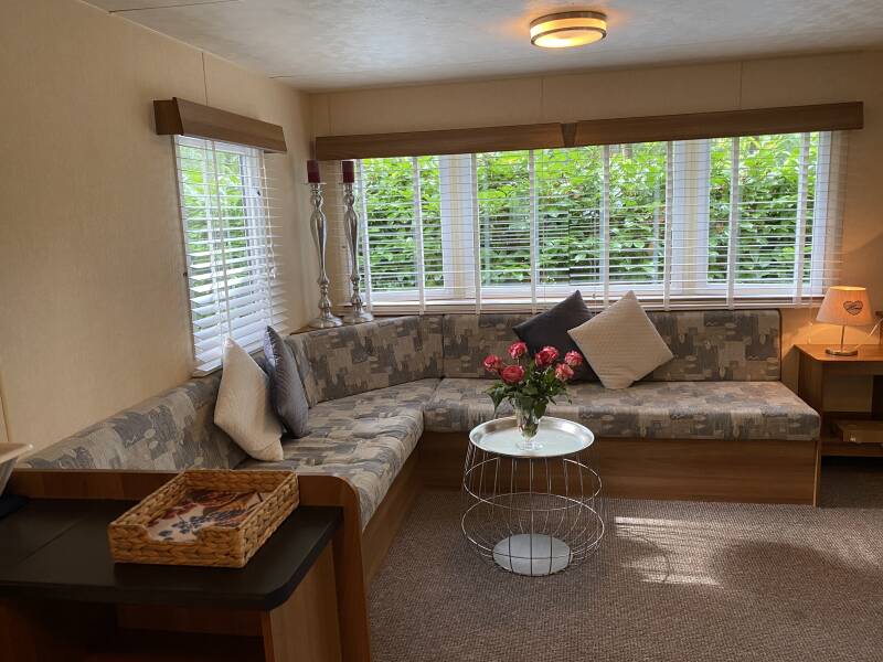 De keuken is ruim opgezet en van alle gemakken voorzien hier blijft alles achter inclusief een splinternieuwe koelkast (aankoopbon aanwezig) Deze stacaravan is voorzien van centrale verwarming.